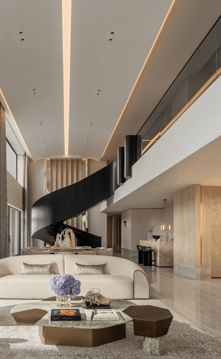 走进建面约826㎡顶复世纪藏品,迎来一场现代奢华美学的视觉盛宴,这是大师精心雕琢出一席可被收藏的流动艺术馆。一座雕塑感的旋转楼梯,如艺术品般矗立于空间核心,成为视觉焦点;约22米弧形全景舱阳台,在云端将花都湖景尽收眼底;约148㎡的寰宇会客厅,以世界宽度盛放世家待客之道;专属配备茶室、雪茄室,让塔尖圈层的隐形社交在此交汇。在这里,艺术、自然与生活交融,共同诠释何为传世藏品级的湖居理想
