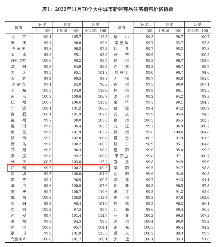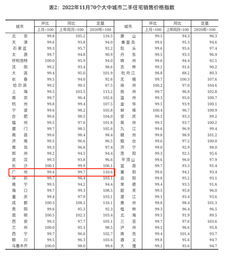 相较北京、上海及深圳,广州这一跌幅偏大。国家统计局城市司首席统计师绳国庆解读称,11月,一线城市的新房、二手房降幅比之上月均扩大了0.1个百分点。在新建商品住宅方面,北京、上海均涨,广州、深圳双降,均降0.5%;二手住宅方面,广州以-0.6%居跌幅之首,但余下三城也均环比下降。