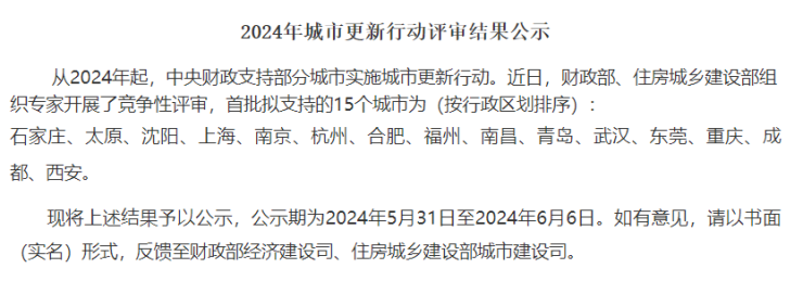 近日,财政部、住房城乡建设部组织专家开展了竞争性评审,首批拟支持的15个城市为石家庄、太原、沈阳、上海、南京、杭州、合肥、福州、南昌、青岛、武汉、东莞、重庆、成都、西安。