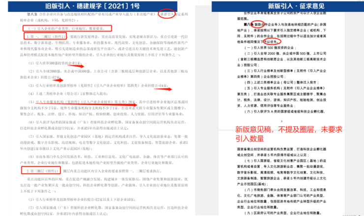 与旧版不同的是,新版意见稿中不提及圈层要求,且仅对产业导入的类型和行业地位作要求,未要求引入数量;