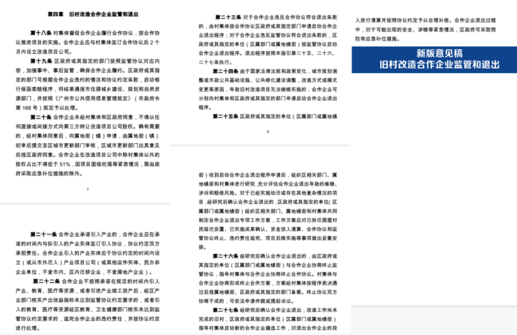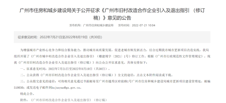 7月21日,为推动城市高质量发展,促进老城市焕发新活力,结合近期我市城市更新项目改造实践,广州市住房和城乡建设局公开征求关于《广州市旧村改造合作企业引入及退出指引 (修订稿)》意见的公告。