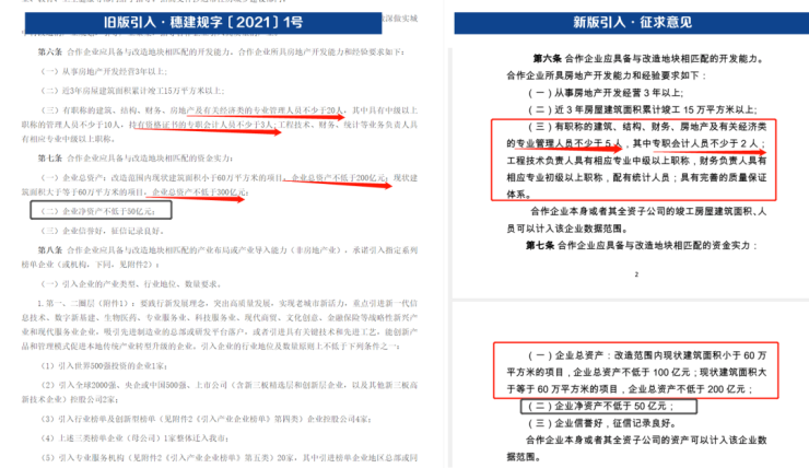 1、对合作企业的“与改造地块相匹配的开发能力、以及资金实力”门槛大幅降低