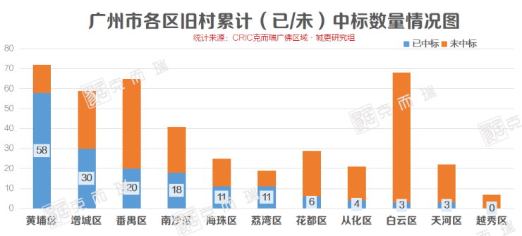其中黄埔区以已中标58个旧村数量,项目数量占比达35%,整体数量排全市排名前列;