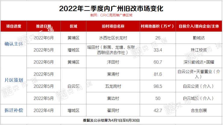 据克而瑞统计,进入2022年,截至发稿时间7月25日,广州旧改市场已有4个旧村改造项目确认了合作企业主体。