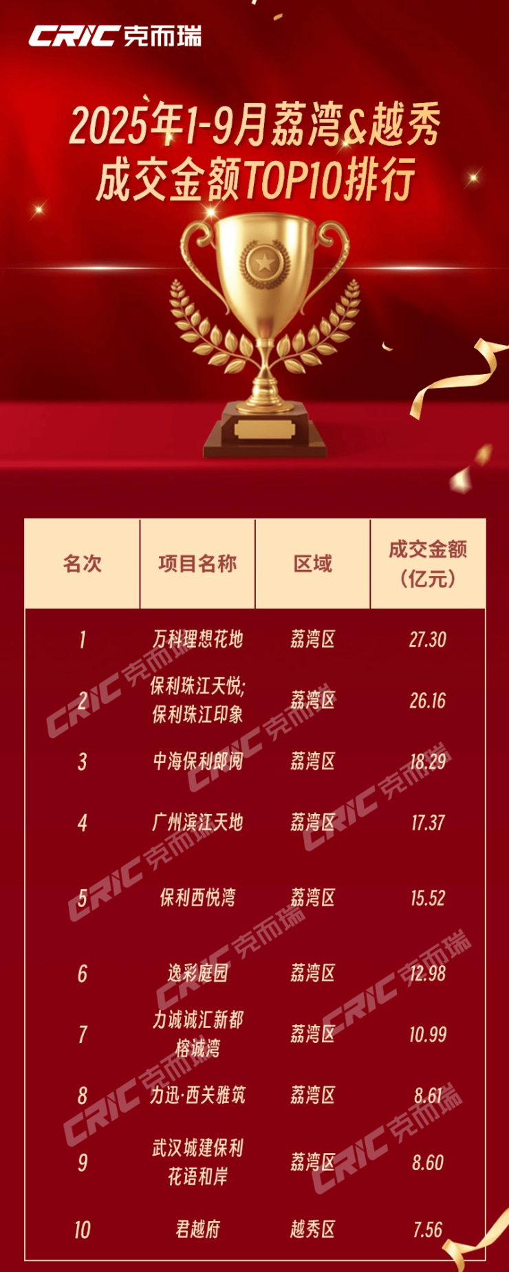 万科理想花地以493套成交、27.3亿元成交金额获得双榜第一,保利珠江天悦、保利珠江印象以382套成交、26.16亿元成交金额获得双榜第二,金额榜第三由中海保利郎阅摘得,今年累计成交18.29亿元,套数榜第三由逸彩庭园收入囊中,今年1-9月累计成交306套。