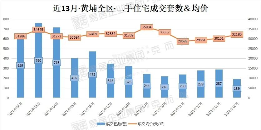 据克而瑞监测,2月黄埔全区二手住宅网签成交套数仅189套,为近13月较低,成交均价一直保持在3字头。