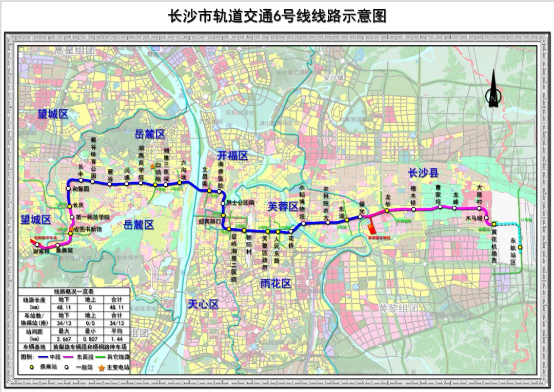 长沙地铁6号线全长48.11公里,西起梅溪湖片区,东至黄花国际机场,是长沙市轨道交通线网中东西走向的“城市窗口型”骨干线路。全线设车站34座,均为地下站,车辆段、停车场、控制中心各1座,主变电所3座。平均站间距为1.4公里,较大站间距2.7公里,最小站间距0.8公里。线路建成开通后,将有效加强河西副中心与城市主中心的联系,串联河西城际轨道枢纽和黄花机场,缓解东西向交通压力,引导城市有序拓展。