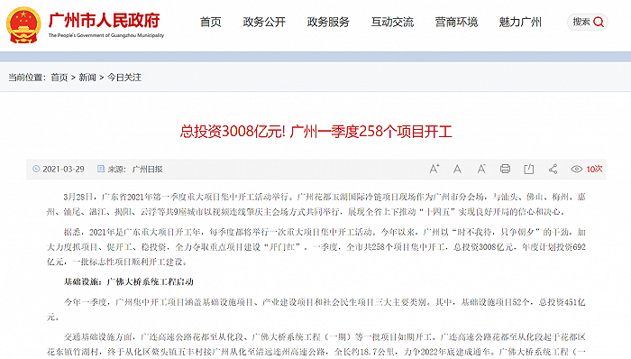较新资讯丨总投资3008亿元!广州一季度258个项目集中开工