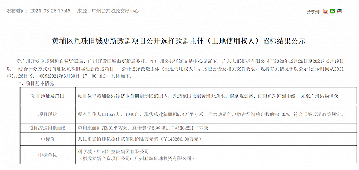3月26日,科学城(广州)投资集团有限公司取得中标结果确认函,正式成为黄埔区鱼珠旧城更新改造项目中标单位,科学城拟成立全资二级公司广州科城鱼珠投资有限公司作为实施单位。