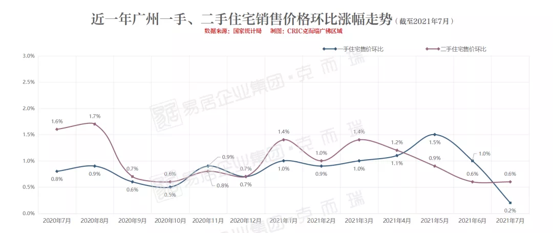 值得注意的是,对于广州,无论一手还是二手住宅售价,环比涨幅均有所回落。从整理的一二手售价涨幅走势来看,自从4月广州调控政策不断升级、“打补丁”加码,一手住宅市场迅速降温,摁住狂跑的涨势,一手售价环比涨幅直接从5月份的1.5个百分点跌至7月份的0.2个百分点。二手住宅市场亦是如此,交投活跃度下降,且比一手市场早一步冷却,环比涨幅已从3月份的1.4个百分点逐步下降到7月的0.6个百分点。