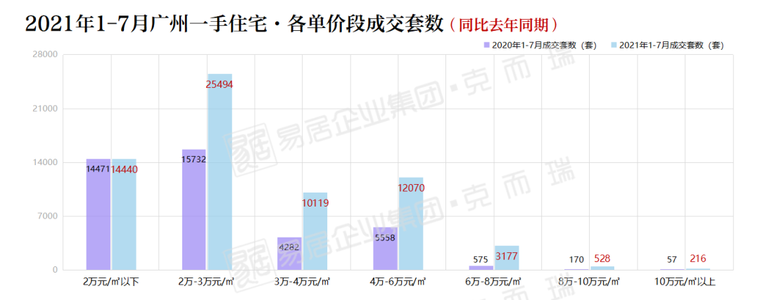 6万-8万元/㎡住宅成交量达到3177套,对比2020年同期的575套,同比增幅达到452.5%,为1-7月各单价段中增幅较大的;