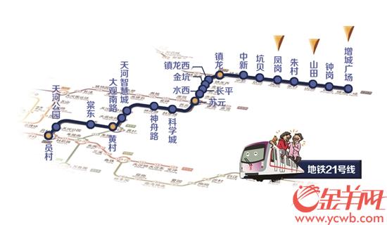 ●21号线在增城区内共有7个站,分快线和慢线,快线跑完全程比慢线节省约15分钟,购房者要注意楼盘附近的地铁站是慢线还是快线站点。目前,楼市热门板块附近的站点有山田站,是慢线站点;增城广场站和凤岗站则是快线站点。