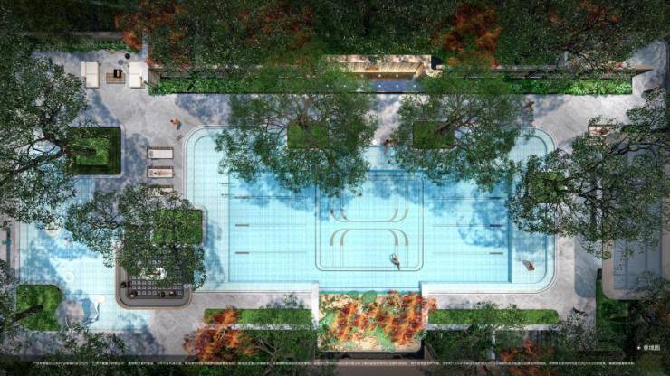 花园泳池:成人、儿童分池玩乐,安心释放玩水天性(成人泳池面积约400㎡,泳道长约30m,儿童泳池面积约120㎡)