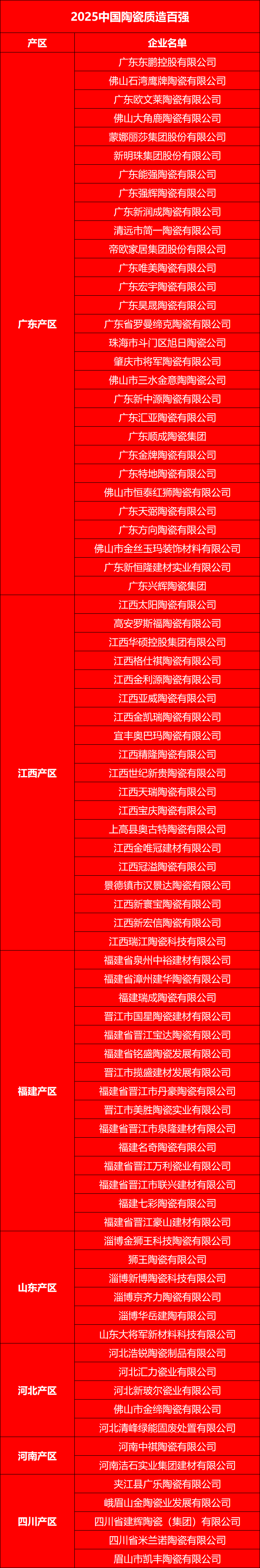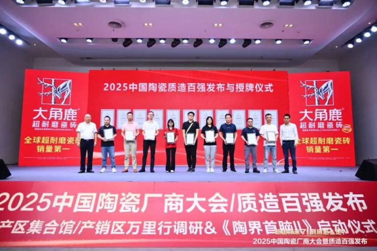 作为对中国陶瓷坚守品质企业的致敬,大会隆重发布、授牌了“2025中国陶瓷质造百强” 榜单并进行了授牌仪式,这些行业头部企业、产区实力企业入选: