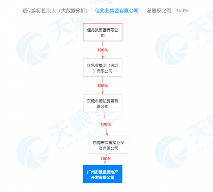 天眼查显示,该项目开发商广州市景晟房地产开发有限公司是东莞市宏隆实业投资有限公司的全资子公司,股权穿透后显示为佳兆业集团百分百控股。据悉,该项目位于增城区荔城街增城大道,于去年6月开放购房意向登记。