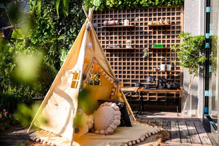 这种布局,让人在房间里,就能感受到外庭院的徐徐微风,以及高挂夜空的星月,不由得步出室外放空自己。或能直接把晾晒衣物收回房间,缩短工作动线,很是便利。这种人性化布局,提升了年轻人的庭院使用频率!