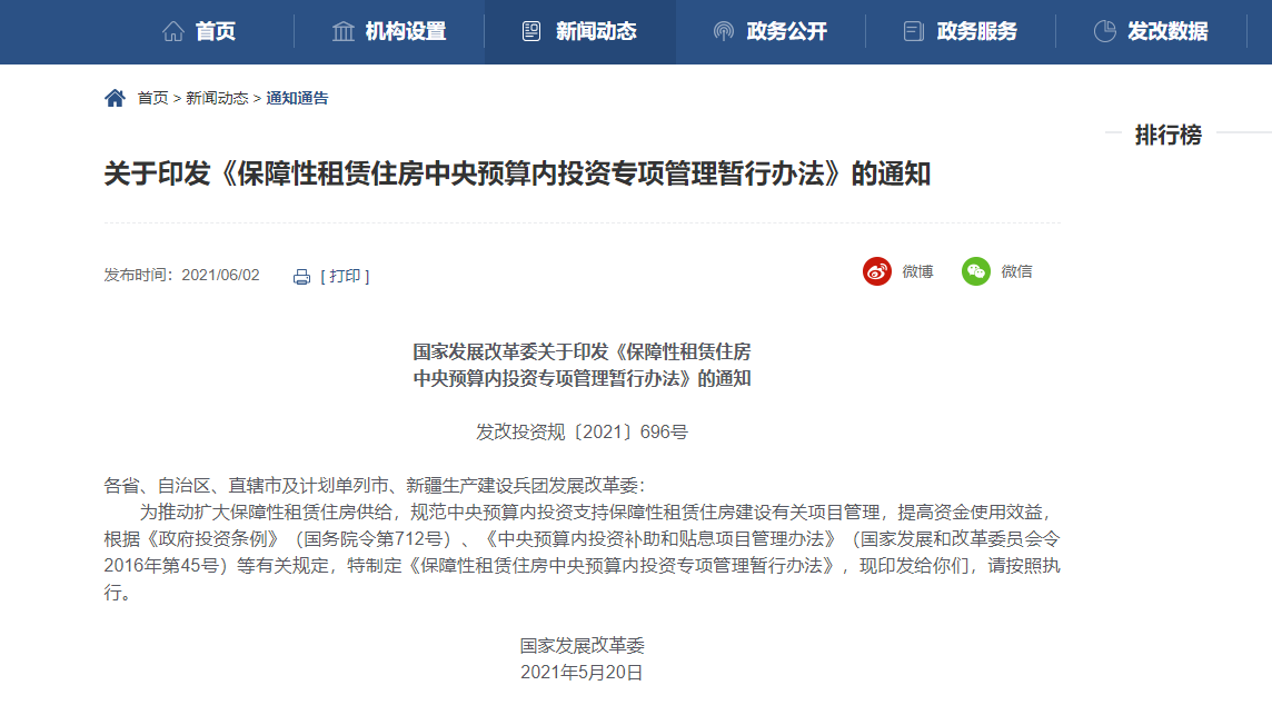 6月2日,国家发展改革委网站发布关于印发《保障性租赁住房中央预算内投资专项管理暂行办法》(以下简称《暂行办法》)的通知。《暂行办法》从发布之日起施行,有效期五年。