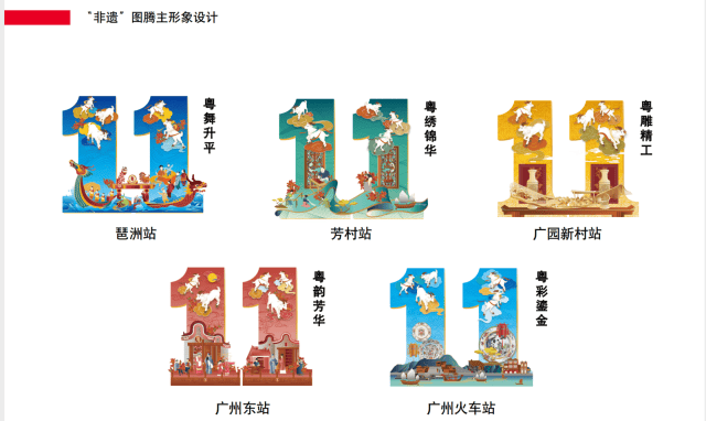 初步设计方案显示,五个重点非遗车站对应五个非遗文化图腾。设计团队通过对广州的世界级、国家级、省市级非遗进行整理、类目合并,选择了最能代表广州岭南文化底蕴的五大类“非遗”项目,与车站设计融合,以文化图腾、文化橱窗、多媒体展现的形式,全方位展示和传播非遗文化。