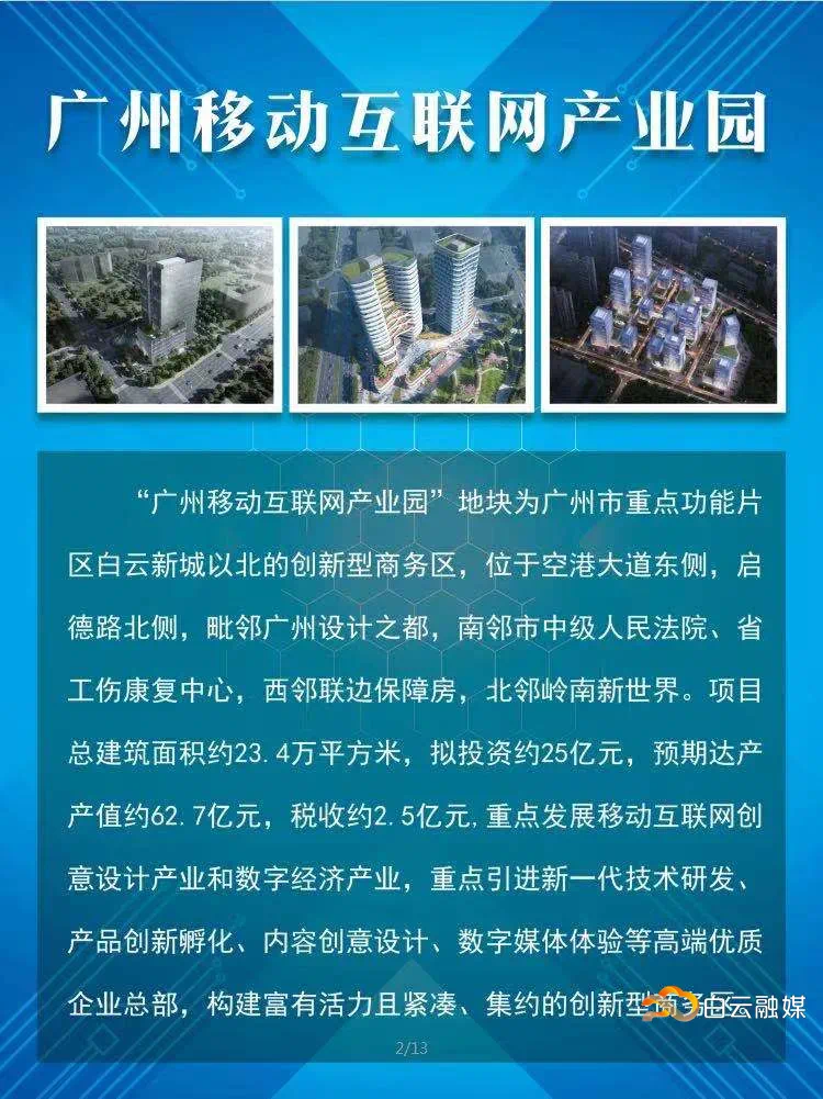 该产业园位于空港大道东侧,启德路北侧,总建筑面积约23.4万平方米,定位为广州市重点功能片区,白云新城以北的创新型商务区,预计总投资额约32.14亿元。
