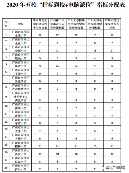 (二)“指标到校+电脑派位” 招生1.2020 年五校初中面向全区采用“指标到校+电脑派位” 方式招生, 按照 1:3 的比例确定电脑派位人数, 上述学校全区电脑派位指标数按照各小学南沙区户籍毕业生人数占南沙区户籍毕业生总人数比例进行分配。2.符合条件的指标生通过电脑派位方式确定录取名单。