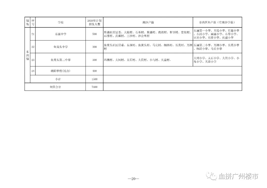 2020 年南沙区义务教育阶段学校初中招生计划表(点击图片可查看大图)