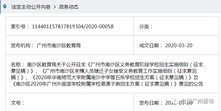 昨日(3月20日),南沙区教育局发布关于公开征求《广州市南沙区义务教育阶段学校招生实施细则(征求意见稿)》、《广州市南沙区来穗人员随迁子女接受义务教育工作实施细则(征求意见稿)》、《2020年华南师范大学附属南沙中学等五所学校招生方案(征求意见稿)》及《南沙区2020年广州外国语学校附属学校港澳子弟招生方案(征求意见稿)》意见的公告。