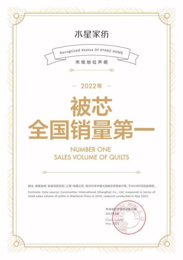 *声明措辞:“水星家纺,2022年被芯全国销量第一” 脚注:“数据来源:欧睿信息咨询(上海)有限公司,按中国大陆2021年、2022年度被芯零售量计算,水星排名第一。于2023年5月完成调研。”