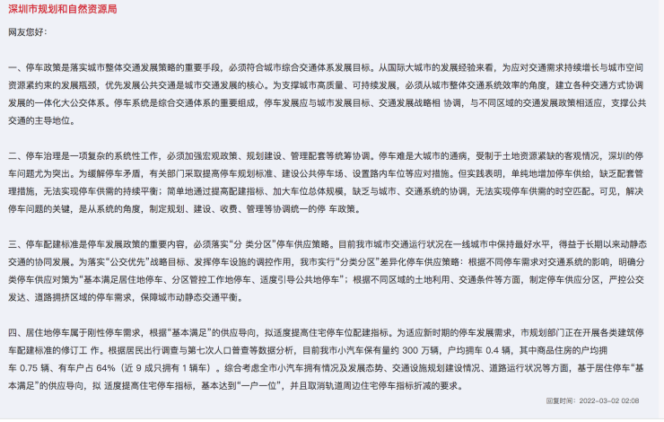 对此深圳市规划和自然资源局于今年3月2日回应称,居住地停车属于刚性停车需求,根据“基本满足”的供应导向,拟适度提高住宅停车位配建指标。为适应新时期的停车发展需求,市规划部门正在开展各类建筑停车配建标准的修订工作。