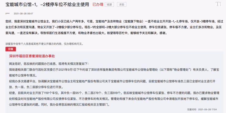 有业主于2021年8月在领导留言板留言称,“我是深圳宝能城市公馆业主,我们小区已经入户两年多,可是,宝能地产及吉祥物业(宝能旗下物业)一直不给业主开放-1,-2,停车场,仅开放-3楼停车场,经过业主们多次和区里沟通,物业又开放了-2楼极少部分停车位。现在-1的全部和-2楼大部分停车位不给业主使用,停车位很紧张,停车极不方便。”对此,深圳市福田区香蜜湖街道办事处于2021年9月28日回应称,“经我办多次搭建平台,协调解决宝能城市公馆业主和宝能地产股份有限公司关于宝能城市公馆停车位的问题,目前宝能城市公馆停车场负三层已全部对业主进行开放、负一层、负二层部分停车位进行开放。经查,目前共对业主开放了1191个车位,其中负一层95个、负二层278个、负三层818个。您反映宝能城市公馆停车位紧张、停车不方便的问题,我办已要求物业管理处积极及时向宝能地产股份有限公司反馈停车位紧张、不方便停车的有关情况。管理处称接下来会向宝能地产股份有限公司申请增加开放地下停车位,缓解宝能城市公馆停车位紧张的问题。”