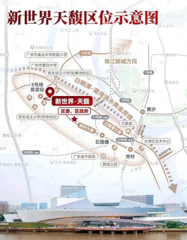白鹅潭作为广州三大世界级商圈之一,正进入高质量发展赛道。在其核心区黄金一公里范围内,文化地标大湾区艺术中心、商业地标太古里&万象城、人居封面新世界·天馥彼此呼应,共同构建高品质生活场域。