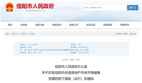 7月6日,信阳市政府发布《信阳市促进房地产市场平稳健康发展的若干措施(试行)》,包括加大财税支持力度、实施购房契税补贴、提高住房公积金贷款较高额度、积极提供金融支持等17项措施。