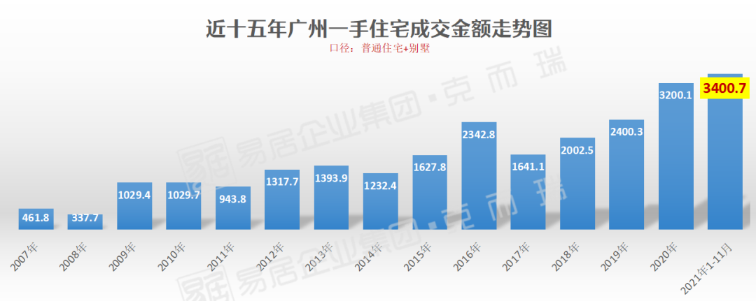 克而瑞统计到,2021年前11个月,广州一手住宅总计网签成交1028.34万㎡,成交套数总计9.5万套,成交总金额达到3400.7亿元!比2020年的3200亿元,还多出200亿元!