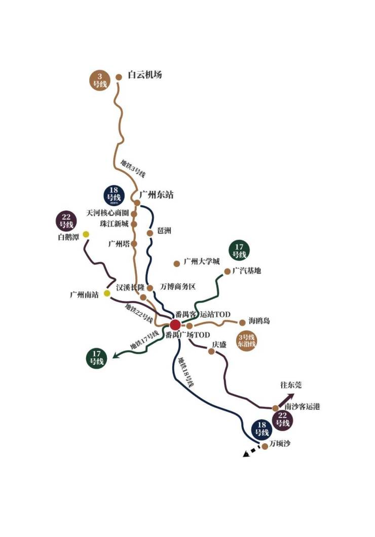 22号线(在建中):北起白云机场,南至万顷沙,从番禺广场2站到广州南站