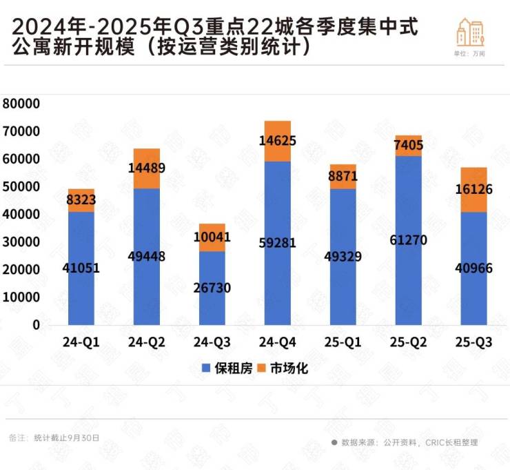 据克而瑞地产研究中心发布的报告显示,克而瑞长租不完全统计的数据显示,2025年三季度全国22个重点城市的集中式长租公寓市场共计约132个新项目入市,新增房源数量约为5.71万套(间),相较2024年Q3同比增长约55%。