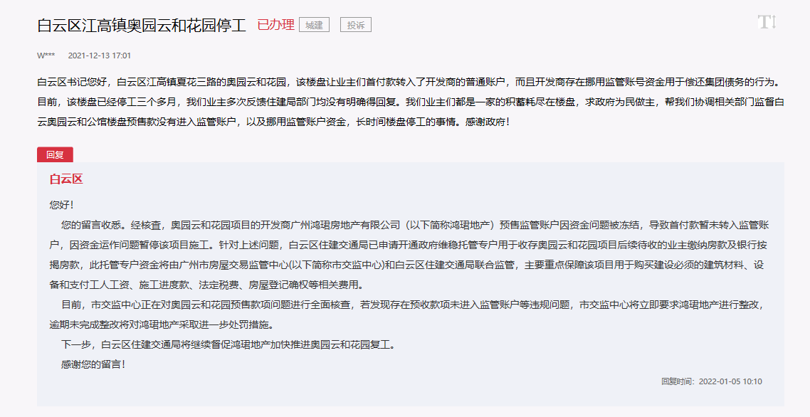 1月5日,人民网“领导留言板”就白云区奥园云和花园停工等反映事项,有了较新回复。回复称,白云区住建交通局已申请开通政府维稳托管专户用于收存奥园云和花园项目后续待收的业主缴纳房款及银行按揭房款。