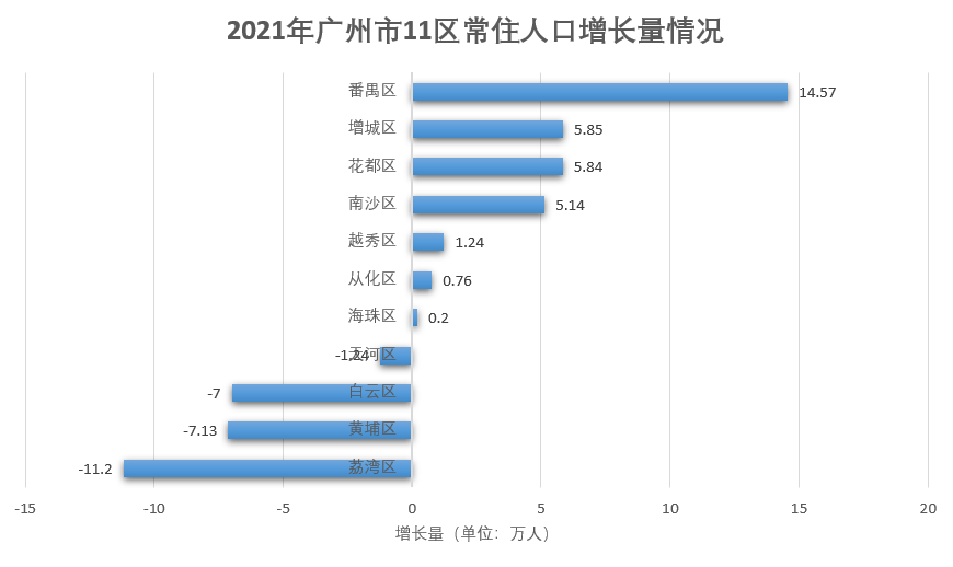除番禺外,2021年,增城、花都、南沙常住人口增长量均超过5万人。荔湾、天河、黄埔、白云这4个区则出现常住总人口回落情况。不过,虽然部分行政区的常住人口出现下滑,但在户籍人口方面,广州各区的基本保持了正增长。