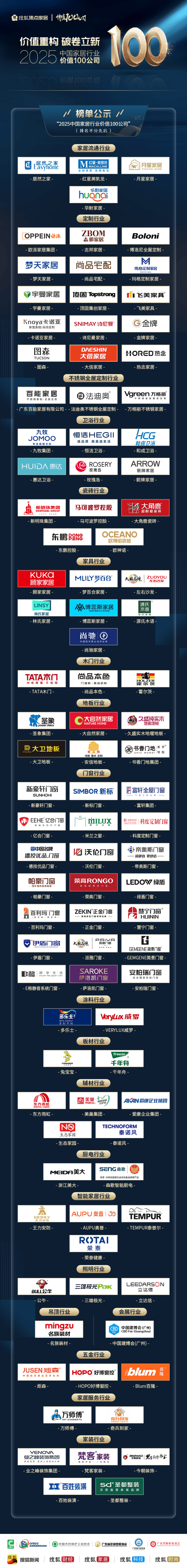 “2025中国家居行业价值100公司”评选,以“价值重构 破卷立新”为主题,面向中国家居行业,从市场、创新、财务和社会贡献四大维度,结合传播力、产品力、运营力进行综合价值评估,遴选中国家行业优秀品牌企业。