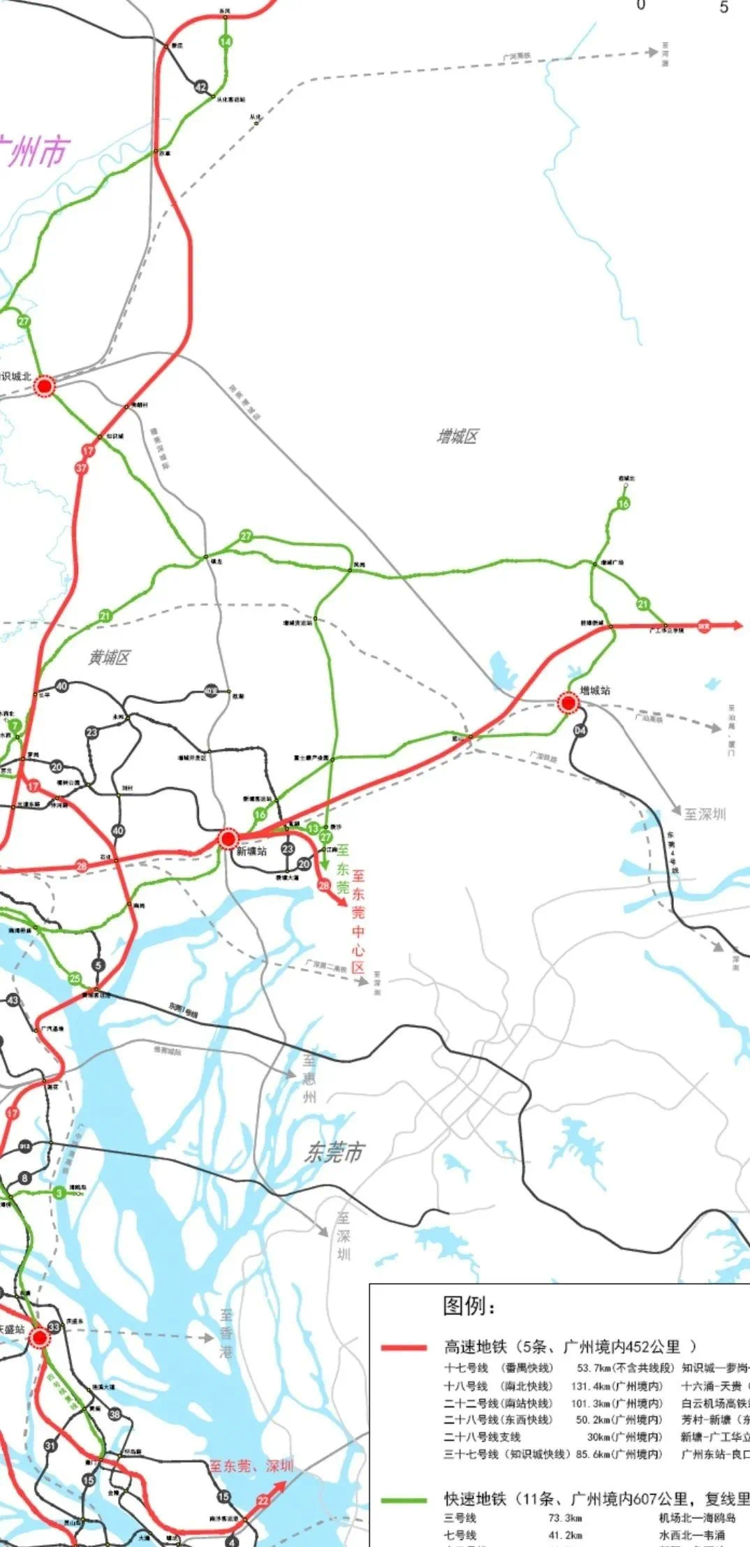 新线网规划广州将打造“高速-快速-普速”三个层级总里程达2029公里的城市轨道交通线网 包括:☉ 5条高速地铁(广州境内452公里)☉ 11条快速地铁(广州境内607公里)☉ 37条普速地铁(970公里)