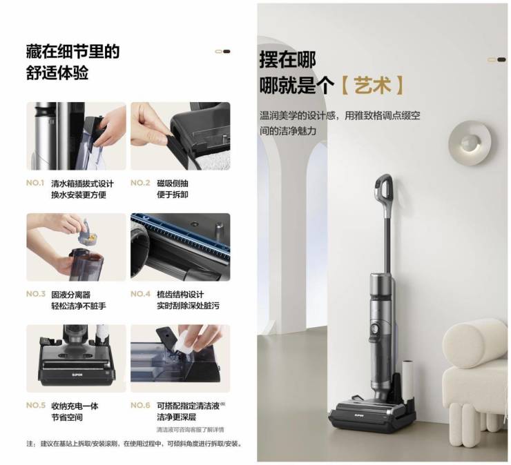 与此同时,苏泊尔洗地机M02H还拥有清水箱插拔式设计、磁吸侧抽、梳齿结构设计、收纳充电一体等诸多贴心细节设计,完善使用体验。