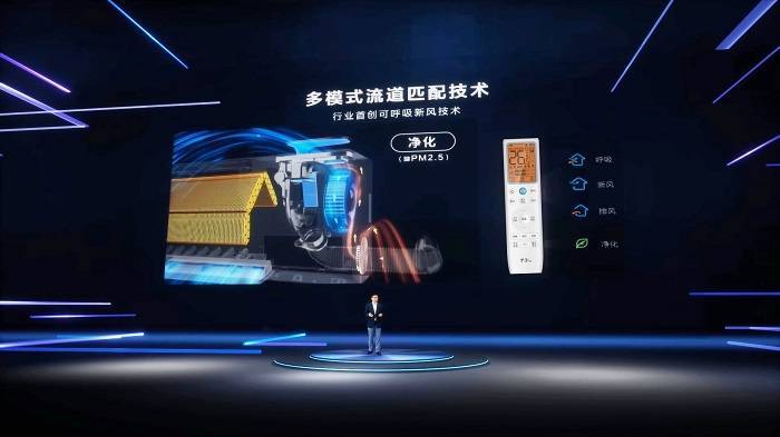 TCL新风空调小蓝翼Ⅲ可以实现呼吸模式-新风吸气模式-排风模式-内循环净化模式等四种模式切换。它在多模式流道匹配技术、双流道倍增技术、“蜗壳、电机、风轮、新风气流”耦合降噪技术三大可呼吸新风技术加持下,创新实现不用二次打墙孔60立方米/h大新风量和30立方米/h排风量,高效提升换气效率。相比于传统新风空调只有新风吸气一种模式,小蓝翼Ⅲ通过吸排的组合方式,功能更强大,真正实现了“空调会呼吸,空气更清新”。