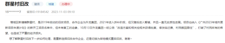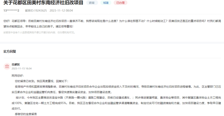 而花都区表示,田美村东南经济旧改项目合作企业出现后续资金投入不及时的情况,导致田美村东南经济社旧改项目进程缓慢。区主管部门已压实压紧合作企业和金融监管机构责任,督促快速落实建设资金,加快项目建设进度。