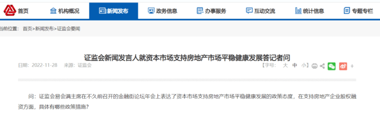 房企融资再迎突破。来自证监会官网的信息显示,11月28日晚间,证监会新闻发言人就资本市场支持房地产市场平稳健康发展答复记者提问,该新闻发言人表示,即日起将恢复涉房上市公司并购重组及配套融资、恢复上市房企和涉房上市公司再融资、调整完善房地产企业境外市场上市政策、进一步发挥REITs盘活房企存量资产作用、 积极发挥私募股权投资基金作用。