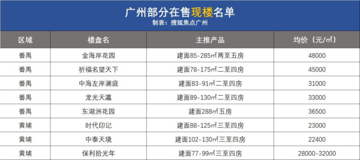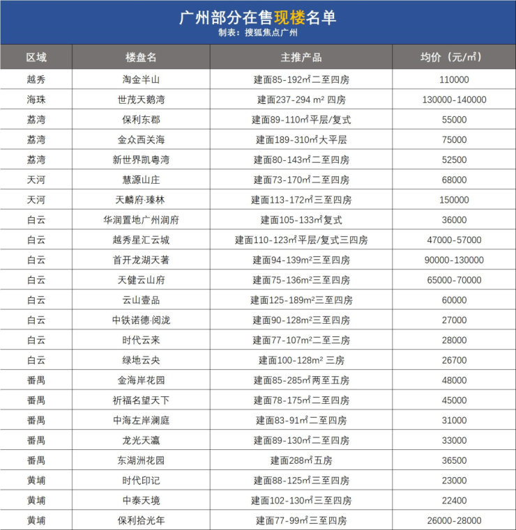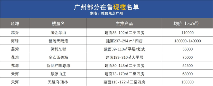 据搜狐焦点不完全统计的广州市中心+近郊(即除增城南沙花都从化4区)20余个现房项目,单价从2字头到10w+均有交易。(ps:以下信息来源于网络,具体实际情况请以项目为准。)