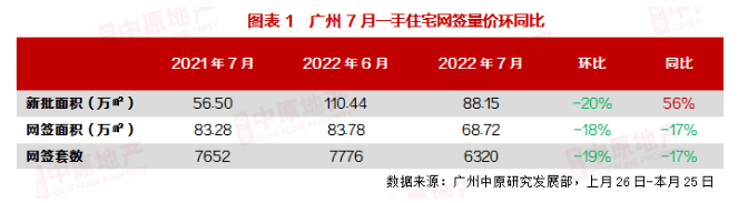 据广州中原发展研究院数据,7月广州新房网签6320宗,环比下跌20%,比去年同期成交下跌17%。
