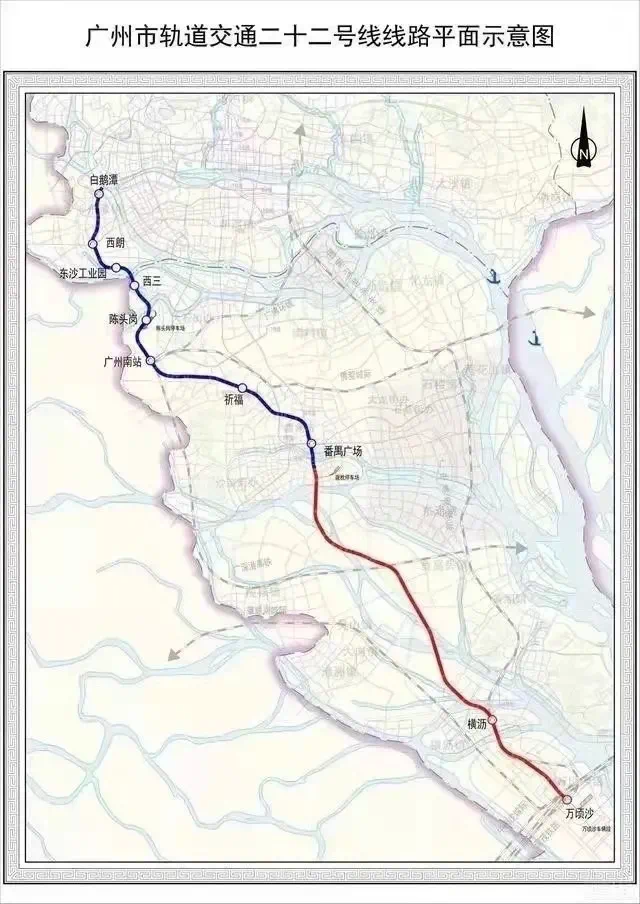 地铁22号线途经白鹅潭CBD、南站商务区及番禺广场等多个核心区域,全长30.8公里,共设车站8座(含换乘站4座),其首通段“番禺广场-陈头岗”预计今年6月投入使用,全线则预计在2022年开通。