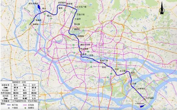 线路全长37.6km,均为地下线敷设方式,全线共设站25座,其中换乘站15座。