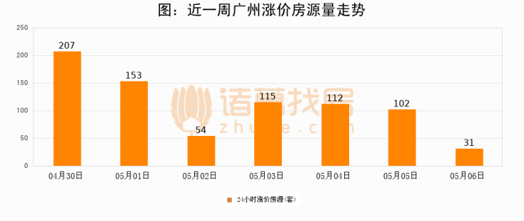 根据诸葛找房数据显示,广州24小时涨价房源量为31套,较05月05日减少71套,环比下降69.6%。与此同时,涨价房源占比小幅回落,对于购房者来说是一个入市窗口期,购房者可抓住时机入市。