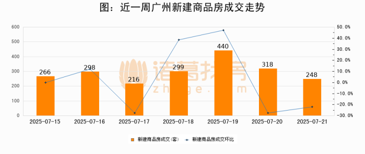 根据广州市住房和城乡建设局数据显示,2025年07月21日广州新建商品房成交248套,较昨日减少70套,环比下降22%。近一周广州新建商品房日均成交298套。07月21日单日成交248套,低于近一周平均水平16.8%。