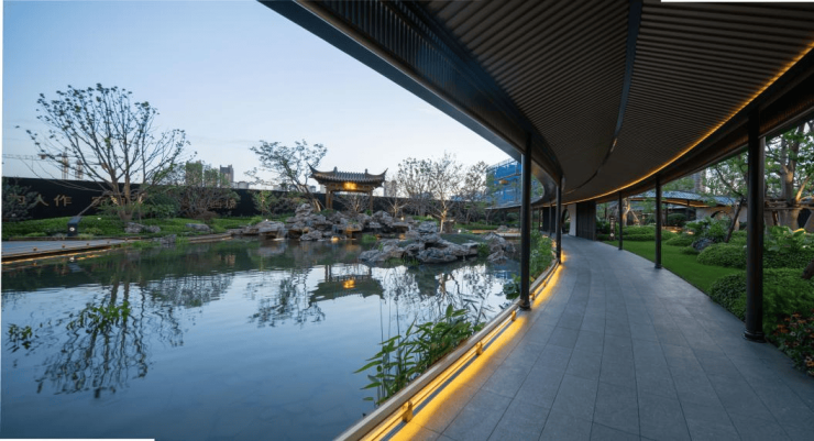 东望府师法这两大江南园林,起点不可谓不高,所以,东望府的园林,无法被单纯的花草树木和亭台水榭所定义,北园拥山,仿制寄畅园的叠山胜景,打造锦汇涟漪、禅隐林苑、凤丘鹤舞、八音水涧、九狮耸秀五重山境,信步其中,随时感受“一园藏山水,十步见风华”的东方意境;南园揽水,取意蠡园的极致水景,打造镜涵水庭、泗水归堂、栏云观水、水沐晨阳四重水境,方寸之间,享尽山水诗意。