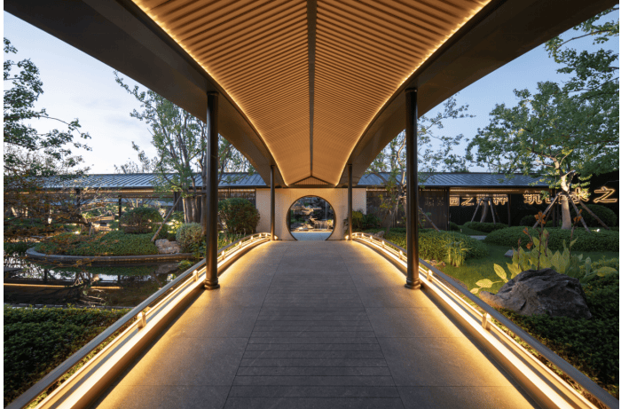 更值得一提的是,东望府还用心打造了三进门,第一重门,是东望府的社区门,古人云,“宅以门户为冠带”,门庭代表着家主的身份与地位,东望府抽取蠡园大门之形,延袭东方传统三间门户格局,以现代潮流极简线条和金属材质,门头“官帽”设计,呈现具有当代中式韵味的大门,站在这个门口,就可感受到高贵雍容的气质;第二重门是景观门,复刻寄畅园内的月洞门,精心推敲的尺寸比例、色彩用材,形成月洞框景的巧思,让园林的设计不是摆设,而是美好生活的一部分;第三重门则是楼栋门,东望府萃取古典王府大门形制,充分诠释东方人居美学。